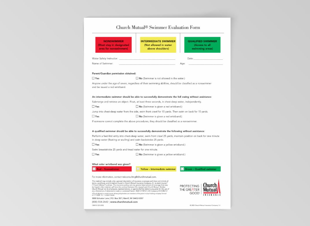 We encourage organizations to screen all swimmers before they spend any extended period in the water. To help you and your staff confidently determine swimming abilities, we’ve developed a Swimmer Safety Program that includes this Swimmer Evaluation Form. Fill out the evaluation form for each swimmer, noting what tests were passed and what color Swim Band was issued to the individual. See our Swimmer Evaluation Guidelines for additional clarification on what qualifies as a “nonswimmer,” “intermediate swimmer” and “qualified swimmer.”